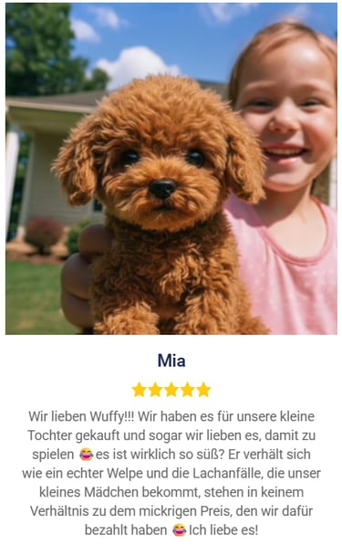 Der Wuffy AI Roboterwelpe ist weit mehr als ein gewöhnliches Spielzeug; er repräsentiert den neuen besten Freund Ihres Kindes und das Haustier der Zukunft, entwickelt mit fortschrittlicher Deutscher Präzisionstechnologie. Als erster Roboterwelpe, der tatsächlich lernt und sich an das Spielverhalten Ihres Kindes anpasst, bringt Wuffy die ungetrübte Freude eines echten Haustiers in Ihr Zuhause, ohne die üblichen Herausforderungen und Verpflichtungen. Das Herzstück von Wuffy ist ein intelligentes KI-System, das sich durch adaptives Verhalten auszeichnet und somit ein einzigartiges, lebensechtes Erlebnis schafft, das weit über die starren Befehle herkömmlicher Roboterspielzeuge hinausgeht. Wuffy bewegt sich, bellt, sitzt und rennt mit verblüffend lebensechten Bewegungen, wackelt mit dem Schwanz, nickt und "lächelt" sogar als direkte und sofortige Reaktion auf die Interaktion Ihres Kindes. Diese berührungsempfindliche Interaktion – sei es durch sanftes Streicheln des Kopfes oder das Rufen seines Namens – fördert spielerisch die Entwicklung von Empathie, Geduld und sanften Umgangsformen bei Kindern. Für Eltern bietet Wuffy die perfekte Lösung: die gesamte emotionale Bereicherung eines Haustiers, jedoch ohne Fellwechsel, Allergien, Unordnung oder die Notwendigkeit früher Spaziergänge, was ihn zur idealen Wahl für Allergiker, Wohnungen und Familien mit einem vollen Terminkalender macht. Jedes Wuffy-Exemplar zeugt von höchster handgefertigter Qualität, da es zu 100% in Handarbeit gefertigt wird, mit sorgfältig handgeformter Nase, Augen und Pfoten, umhüllt von hochwertigem, strapazierfähigem Kunstleder. Diese Liebe zum Detail und die Deutsche Exzellenz in der Technik garantieren ein langlebiges und realistisches Spielerlebnis. Wuffy trägt aktiv dazu bei, ruhige und bildschirmfreie Momente für die Familie zu schaffen, indem er Kinder dazu anregt, ihre Fantasie zu nutzen und Geschichten ohne digitale Hilfsmittel zu erzählen, während gemeinsame Aktivitäten wie kleine "Spaziergänge" den familiären Zusammenhalt stärken. Aufgrund der hohen Nachfrage und als Teil unserer Einführungskampagne bieten wir Ihnen jetzt die Gelegenheit, diesen einzigartigen Begleiter zu einem zeitlich begrenzten Sonderpreis zu erwerben, mit einem Rabatt von bis zu -70% auf den regulären Verkaufspreis. Um Ihnen eine risikofreie Entscheidung zu ermöglichen, gewähren wir eine umfassende 30-Tage-Geld-zurück-Garantie, sodass Sie Wuffy in aller Ruhe testen können. Wuffy ist sofort spielbereit und auf Lager, bereit, sich den Tausenden von glücklichen Kunden anzuschließen, die bereits die Magie dieses futuristischen Hündchens erleben. Bestellen Sie noch heute und schenken Sie Ihrem Kind einen Freund, der Freude, Lernen und technologische Zuverlässigkeit vereint.